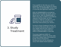If you qualify for the trial, you will be placed by chance into a group to receive either IDRX-42 or sunitinib (the approved treatment).