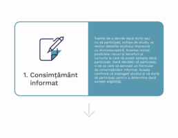 Înainte de a decide dacă doriți sau nu să participați, echipa de studiu va revizui detaliile studiului împreună cu dumneavoastră. Acestea includ posibilele riscuri și beneficii și lucrurile la care vă puteți aștepta dacă participați. Dacă decideți să participați, vi se va cere să semnați un Formular de consimțământ informat. Acesta confirmă că înțelegeți studiul și că doriți să participați pentru a determina dacă sunteți eligibil(ă).